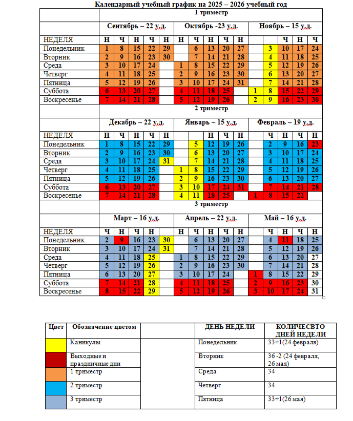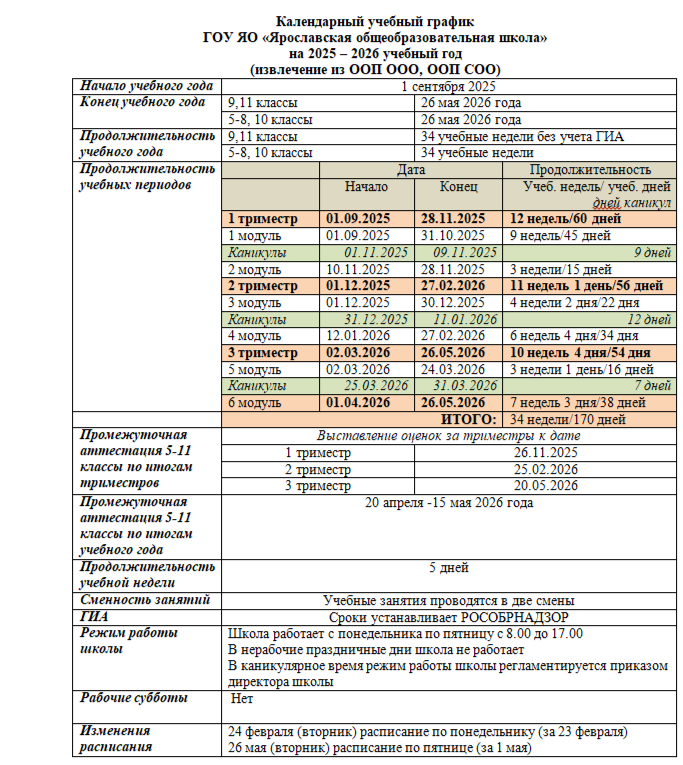 Календарный учебный график ГОУ ЯО "Ярославская общеобразовательная школа" на 2025-26 у.г.
